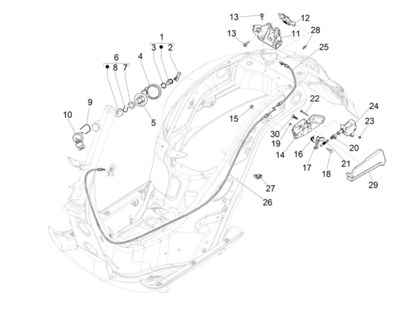 Kabeldrag (lång) för lås på sittbänk -PIAGGIO- Vespa GT 250 (ZAPM45102), Vespa GT L 125 (ZAPM31100, ZAPM31101), Vespa GT L 200 (ZAPM31200), Vespa GTS 125 (ZAPM31300, ZAPMA3100, ZAPMA3200, ZAPMA3700), Vespa GTS 150 (ZAPMA3200, ZAPMA3100), Vespa GTS 250 (ZA