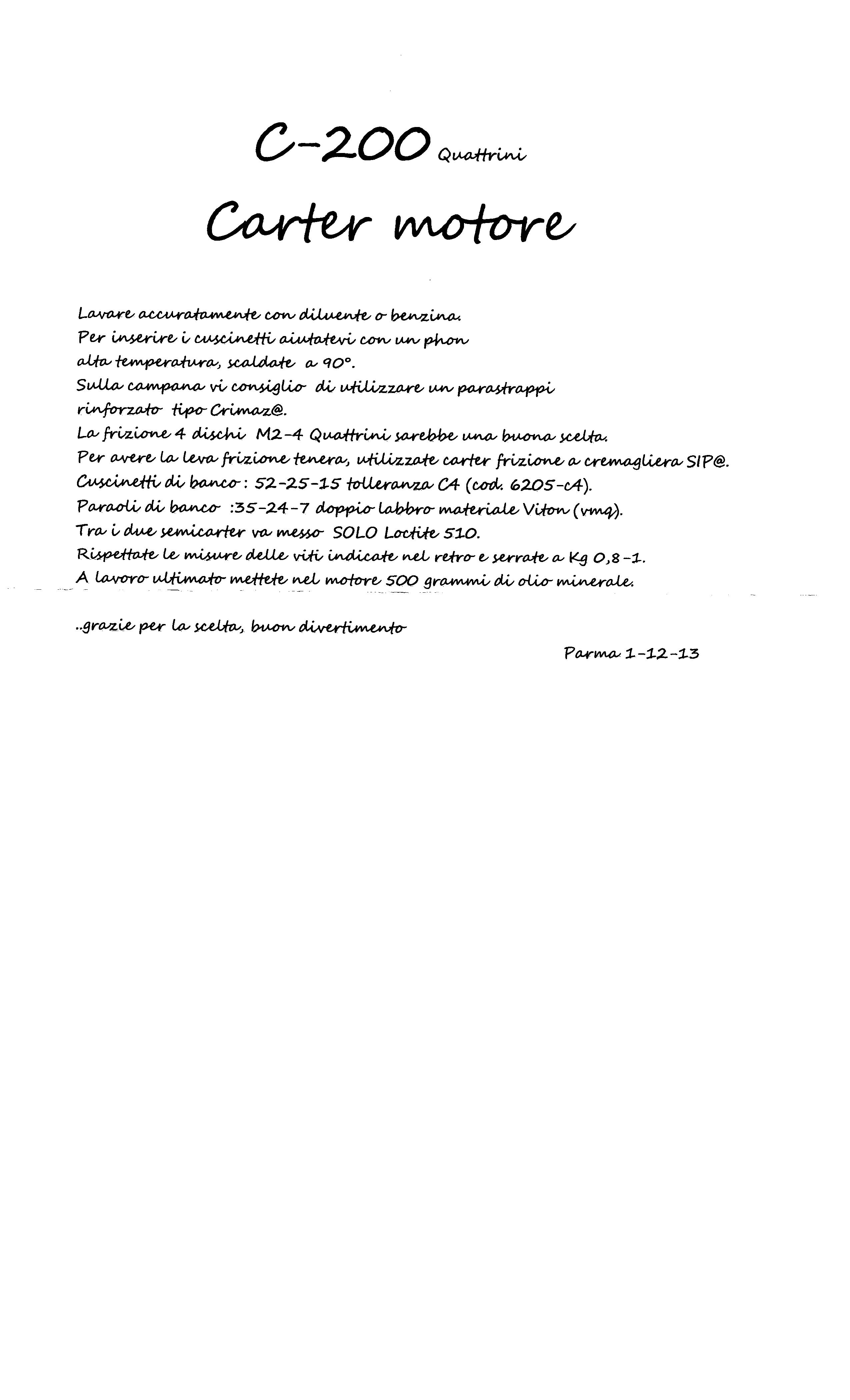 Motorhuset är inte tätat med tätningspapper. Det tätas med flytande tätningsmedel, t.ex. Loctite 510 eller Normfest Plastomar. Åtdragningsmoment för cylinderskruvarna 18-20 Nm (M8). Åtdragningsmoment för husets skruvar 8-10 Nm (M6). Mängd växellådsolja: 500 ml mineralolja (t.ex. Runge SAE30). Oljeblandningsförhållande: 4% (1:25)