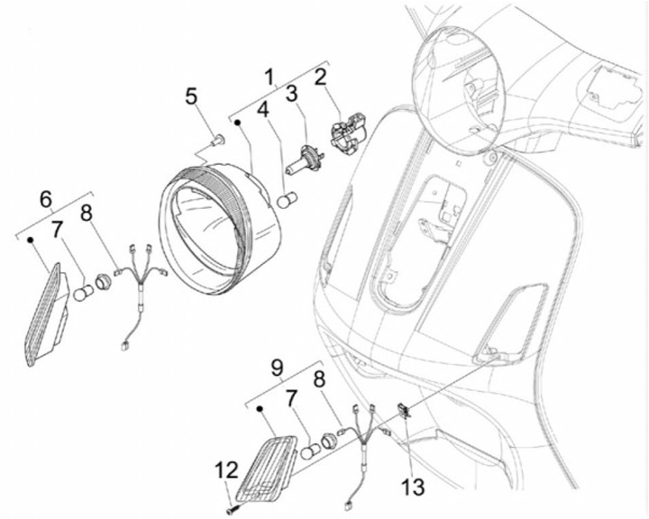 Strålkastare, utan parkeringsljus, högertrafik -PIAGGIO- Vespa GTS 150 (ZAPMA3200, ZAPMA3100), Vespa GTS 250 (ZAPM45100), Vespa GTS Super 125 (ZAPM45300, ZAPMA3100, ZAPMA3200, ZAPM45301), Vespa GTS Super 300 (ZAPM45200, ZAPM45202, ZAPMA3300)