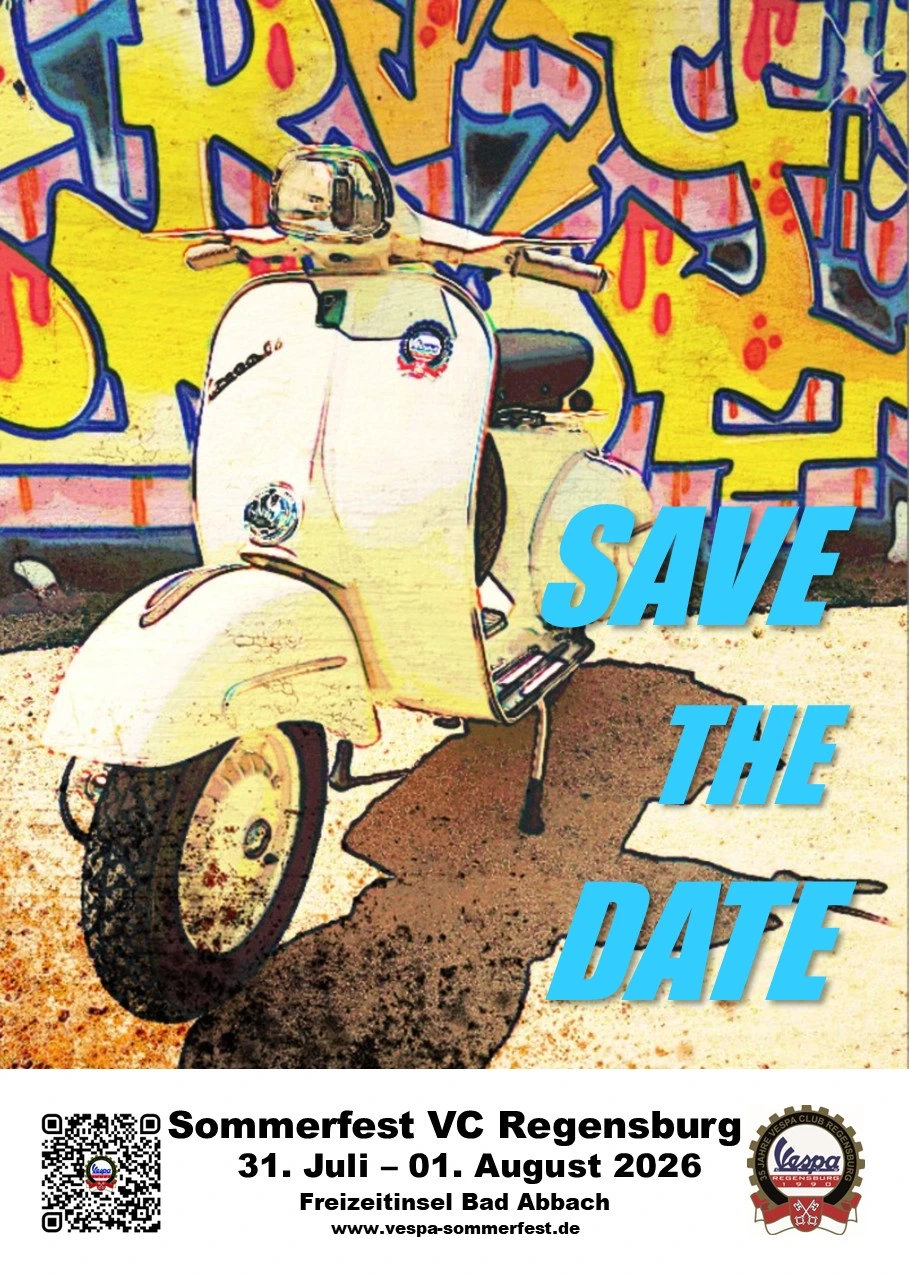 Vilken helg! Den 1–2 augusti firade Vespa Club Regensburg sitt 35-årsjubileum på fritidsön Bad Abbach. Redan två veckor innan stod det klart att vädret inte skulle bli helt på vår sida. Men VCR har under de senaste åren aldrig låtit sig nedslås av det. Sloganen «Vi kör ändå» spreds i sociala medier – inte minst tack vare de specialskapade AI-avatarerna Caroline Cosa och Roman Rollig, som blev virala.