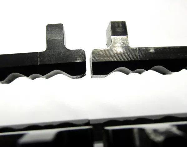 Till vänster är en annan BGM växlingsklo från den nuvarande serien och till höger en ny (!) Växlingsklo från Piaggio-väskan Det som redan är uppenbart visuellt blir tydligt vid mätning. Piaggio sätter sina egna standarder här ... Vid 0,8 mm är bakslaget helt klart för stort. En sådan växlingsklo leder oundvikligen till att kugghjulen hoppar ut under belastning.