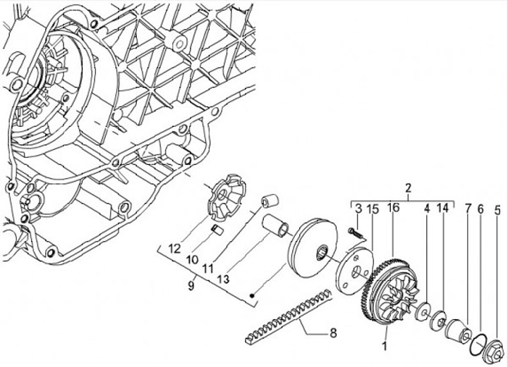 Polea fija -PIAGGIO- Vespa GT L 200, Gilera Runner 1 180, Runner 2 (RST) 200, DNA 180, Piaggio Beverly 200, Carnaby 200, Hexagon 180, Liberty 200, X8 200, X9 180, X9 200, X9 Evo 200, Aprilia Atlantic 200, Scarabeo 200, Sport City 200, Sport City