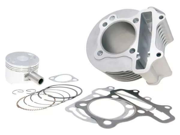 Der Zylinder wird wie abgebildet mit allen notwendigen Dichtungen, Kolben und Kolbenringen geliefert. Der originale Zylinderkopf wird weiter verwendet.