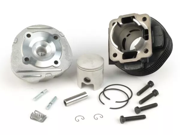 Um ein Zerlegen des Motors zu vermeiden, bieten wir einen passend bearbeiteten Zylinder an. Dieser ersetzt den alten Zylinder 1:1. Unsere Wahl fiel auf den Polini 75ccm in der Racing Ausführung. Mit einem sehr schönen Drehzahlband und einer Leistung von über 4PS, ist er genau der richtige Kandidat um das etwas zu lang geratene Getriebe der V50 zu ziehen. Das breite Drehzahlband hilft deutlich, den langen Sprung vom zweiten in den dritten Gang zu überwinden.